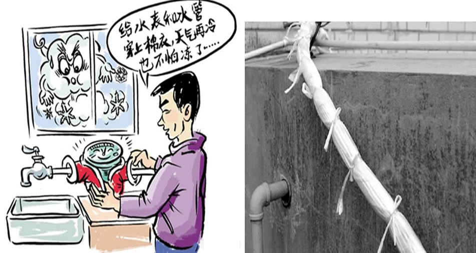 气温达到零摄氏度水就开始结冰了。可用棉麻织物、塑料、泡沫等物体对水管等用水设备进行包裹保温。